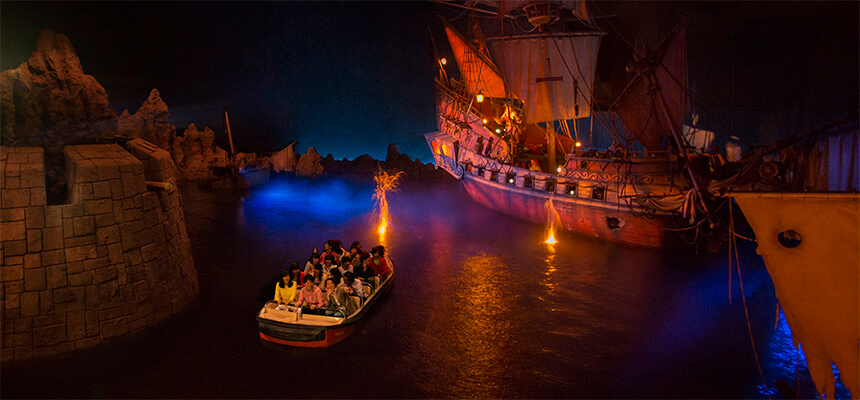 보트 위로 날아다니는 포탄, 물보라, 해적들의 거친 목소리, 다양한 음악 등 연출이 뛰어난 어트랙션입니다. 스릴과 모험하는 기분을 느낄 수 있으나 다크 한 분위기라 그런지 어린아이들은 조금 무서워할 수 있습니다.
